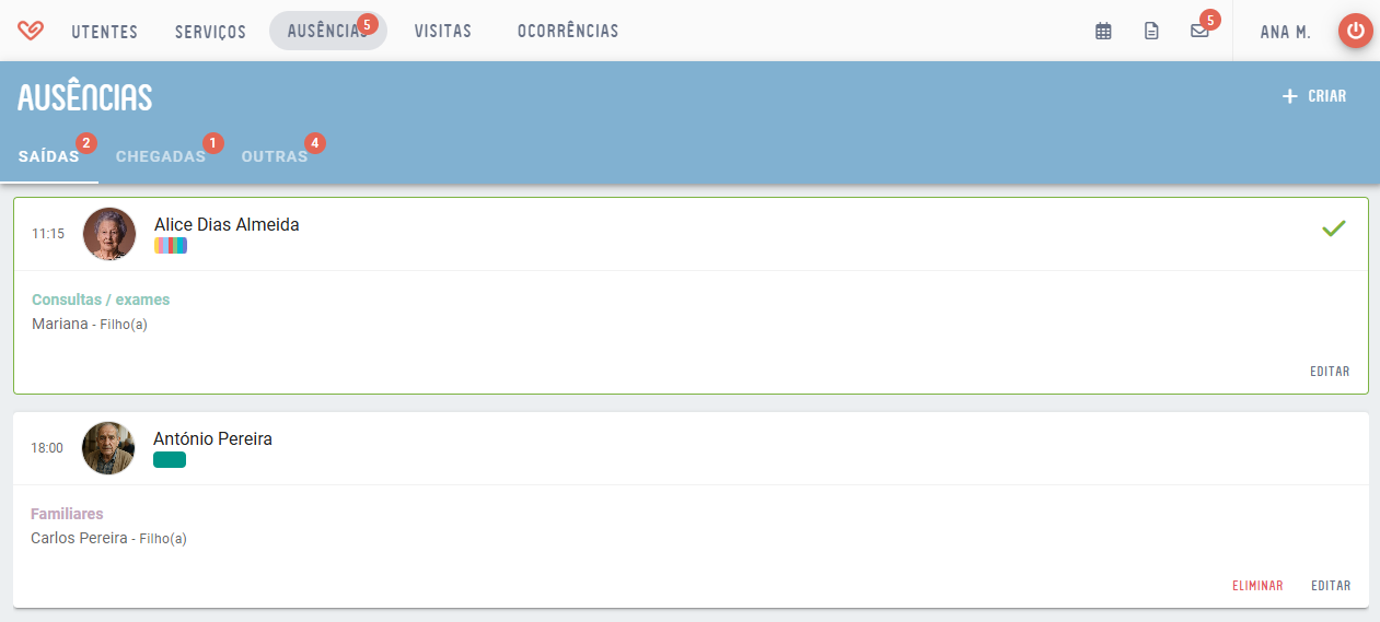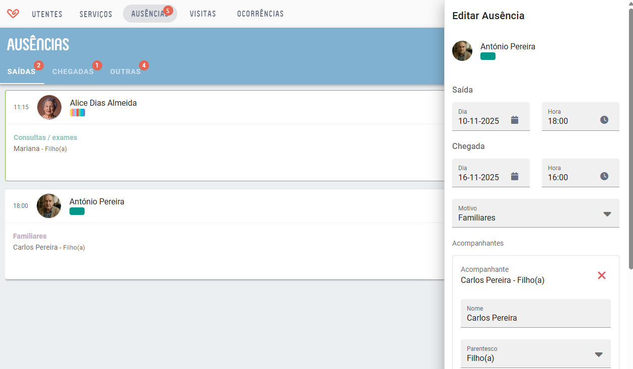 - No menu de navegação, o item Ausências tem um contador que indica o número de utentes ausentes no momento.