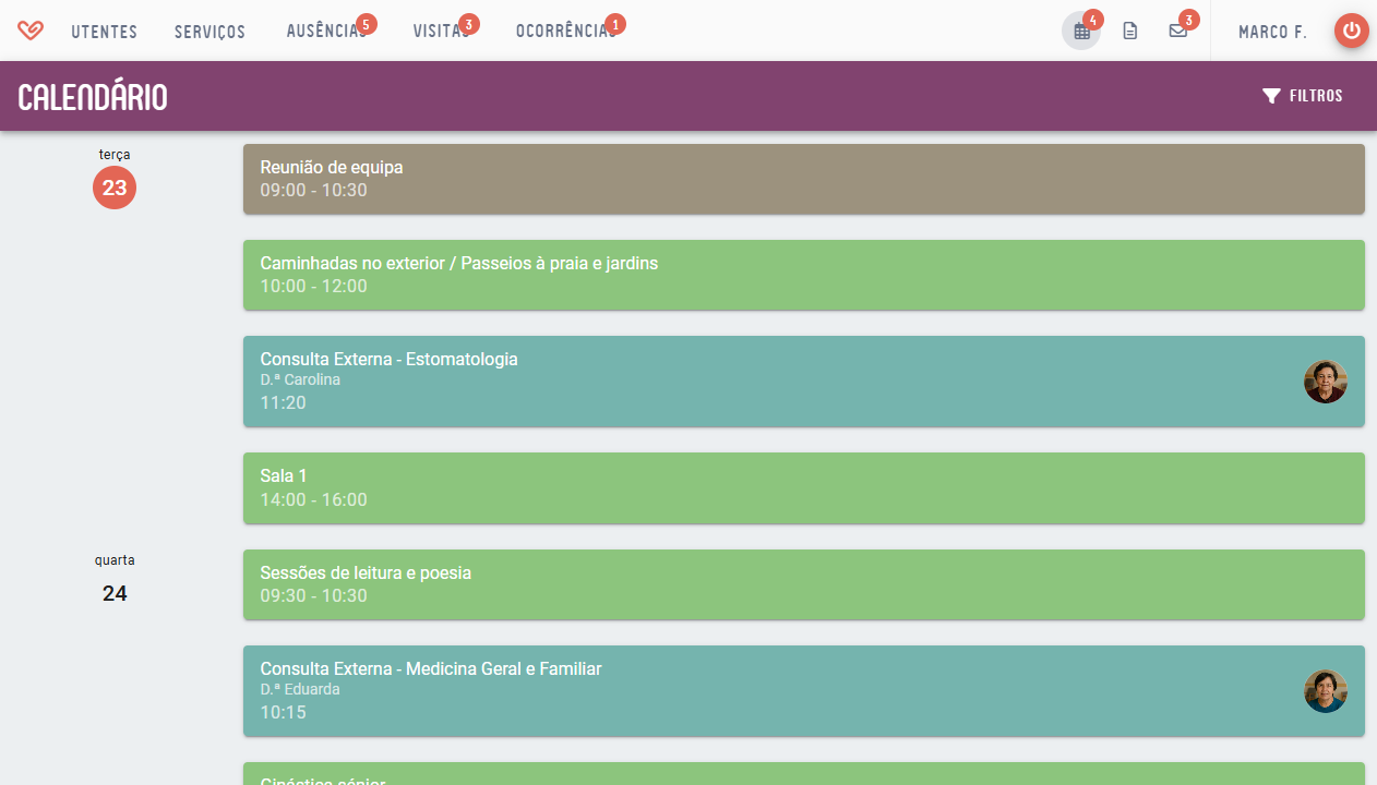 - Na secção Utentes, pode filtrar pelos eventos de utentes com determinados critérios.