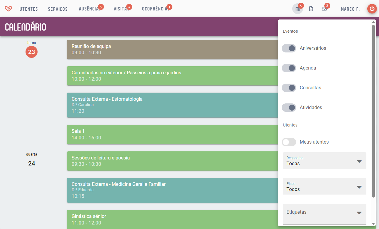 Os eventos do tipo Atividades e Consultas só são apresentados se o utilizador tiver permissões para aceder a estas áreas.