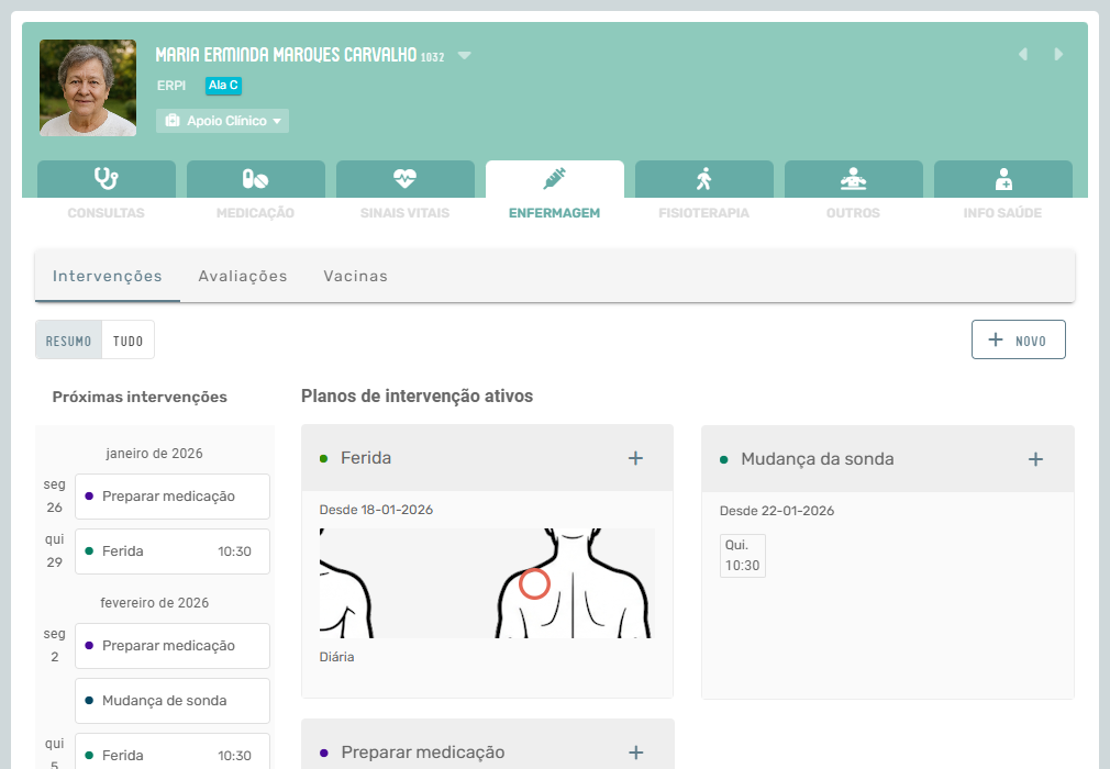 No separador Intervenções o enfermeiro planeia e regista intervenções de enfermagem. Este separador inclui duas vistas: