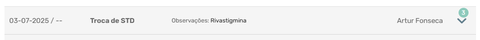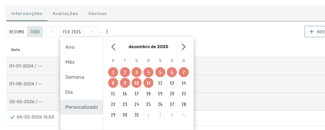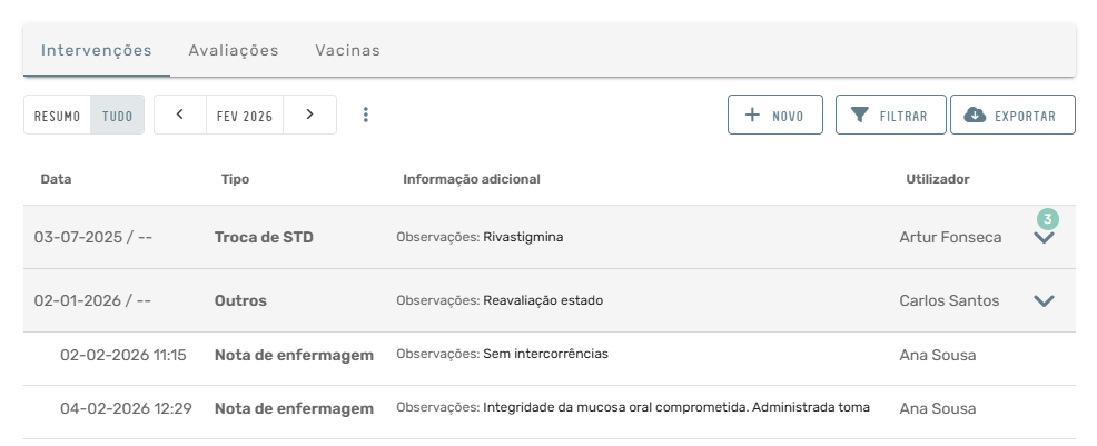 A vista Tudo apresenta uma lista com todos os registos de enfermagem. Por predefinição, são apresentados os registos do mês atual, agrupados por plano de intervenção.