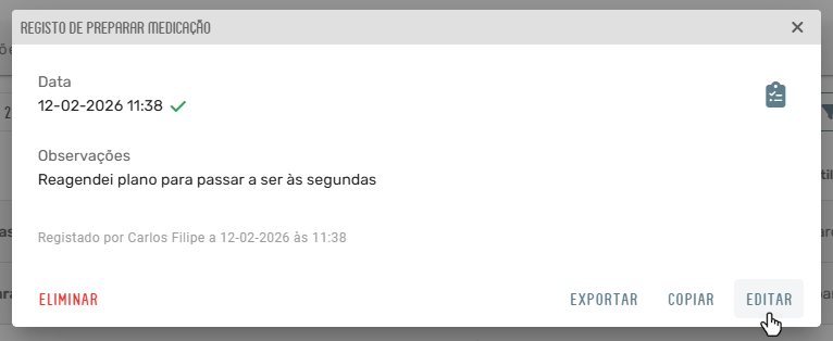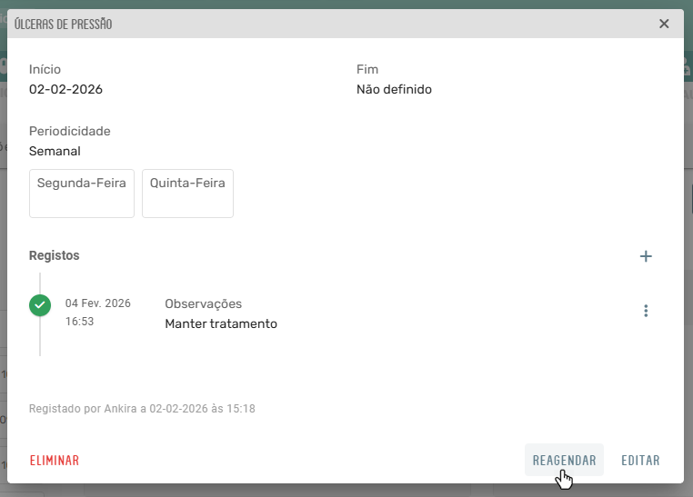 - Reagendar - Quando as intervenções futuras precisam de ser ajustadas, sem alterar os registos já realizados.